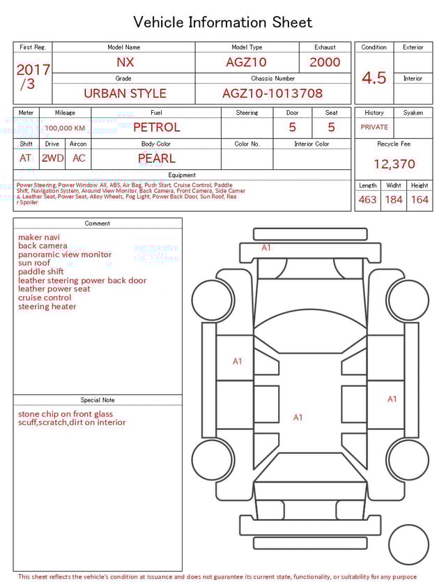 Notas da ficha de inspecção emitida pela casa de leilão